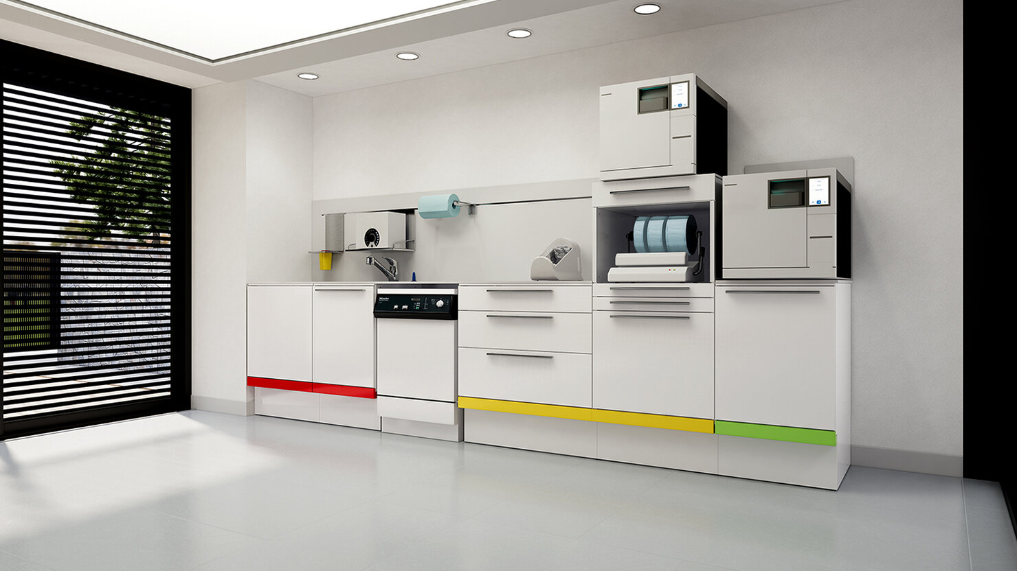 Pratici supporti a parete per il contenitore di rifiuti speciali, la vasca di disinfezione e la vasca a ultrasuoni.