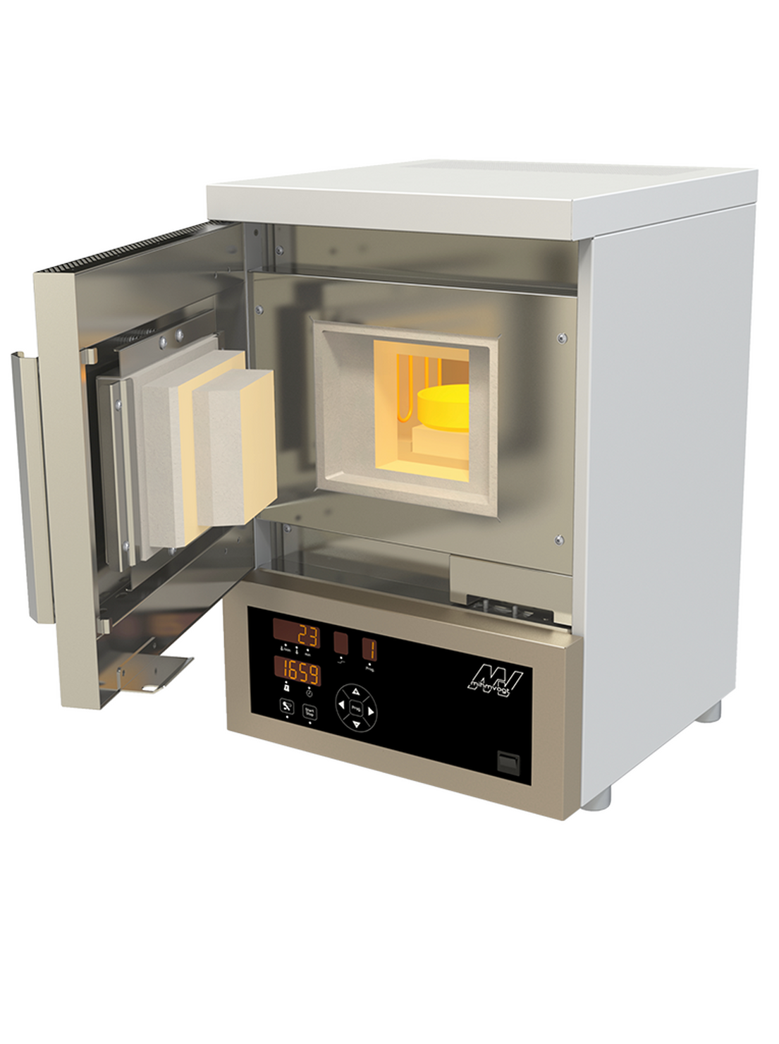 Quattro elementi riscaldanti di alta qualità di disilicido di molibdeno (MoSi₂) permettono al forno di raggiungere una temperatura massima di sinterizzazione di 1650°C con velocità di riscaldamento fino a 25°C/min.