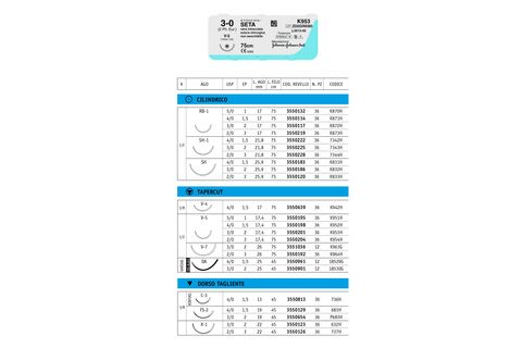 Conf. da 12 pezzi - calibro 3/0 - lunghezza filo 75 cm - curvaturaago 1/2 - tipo ago V-7 - lunghezza ago 26 mmCodice produttore: ETK963GCodice articolo: 3551036 disponibilità immediata |