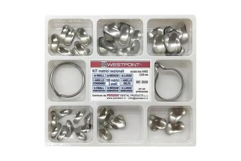 Le matrici sezionali preformate SMS Westpoint in acciaio inox rappresentano una soluzione tecnica avanzata per la gestione dei punti di contatto nei restauri dentali, in ambito odontoiatrico conservativo. Queste matrici sezionali preformate vengono utilizzate per facilitare la realizzazione di restauri diretti in composito, garantendo un adattamento ottimale al dente e un preciso controllo della forma del punto di contatto interprossimale.
