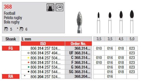 - Varianti per tipo di gambo: FG (per turbine ad alta velocità), RA (per manipoli contrangolo, esclusivamente grana media misura 016)